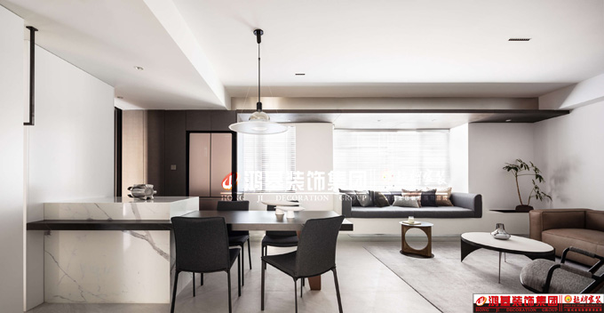 場景感,瓶子形制的吊燈將暖黃光線溫柔灑落,映襯著油藍色的布藝座椅。冷暖色互補的幾何裝飾個性時尚賦予